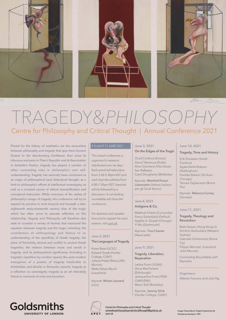 Pivotal for the history of aesthetics are the encounters between philosophy and tragedy that span from Ancient Greece to the decolonizing Caribbean. Ever since its infamous exclusion in Plato’s Republic and its theorisation in Aristotle’s Poetics, tragedy has played a number of often contrasting roles in philosophy’s own self-understanding. Tragedy has variously been conceived as an origin of philosophical (and dialectical) thought, as a limit to philosophy’s efforts at intellectual sovereignty, as well as a constant source of ethical exemplification and conceptual instruction. While conscious of the stakes of philosophy’s image of tragedy, this conference will try to expand its purview to look beyond and beneath a late-eighteenth early-nineteenth century idea of the tragic which has often come to saturate reflection on this relationship. Tragedy and Philosophy will therefore also seek to consider a variety of themes that transcend the equation between tragedy and the tragic, including: the contribution of anthropology and history to an understanding of the specificity of Greek tragedy; the place of femininity, lament and conflict in ancient Greek tragedies; the relation between music and words in tragedy, and its philosophical significance (including in tragedy’s repetition by modern opera); the early modern emergence of a poetics of tragedy irreducible to Aristotelian and Idealist or Romantic variants; tragedy as a reflection on sovereignty; tragedy as an art intimately linked to moments of crisis and transition.
