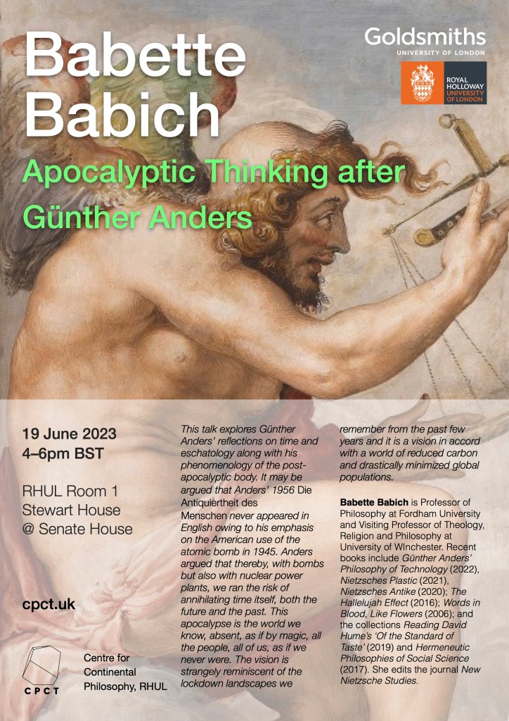 This talk explores Günther Anders’ reflections on time and eschatology along with his phenomenology of the post-apocalyptic body. It may be argued that Anders’ 1956 Die Antiquiertheit des Menschen never appeared in English owing to his emphasis on the American use of the atomic bomb in 1945. Anders argued that thereby, with bombs but also with nuclear power plants, we ran the risk of annihilating time itself, both the future and the past. This apocalypse is the world we know, absent, as if by magic, all the people, all of us, as if we never were. The vision is strangely reminiscent of the lockdown landscapes we remember from the past few years and it is a vision in accord with a world of reduced carbon and drastically minimized global populations.
