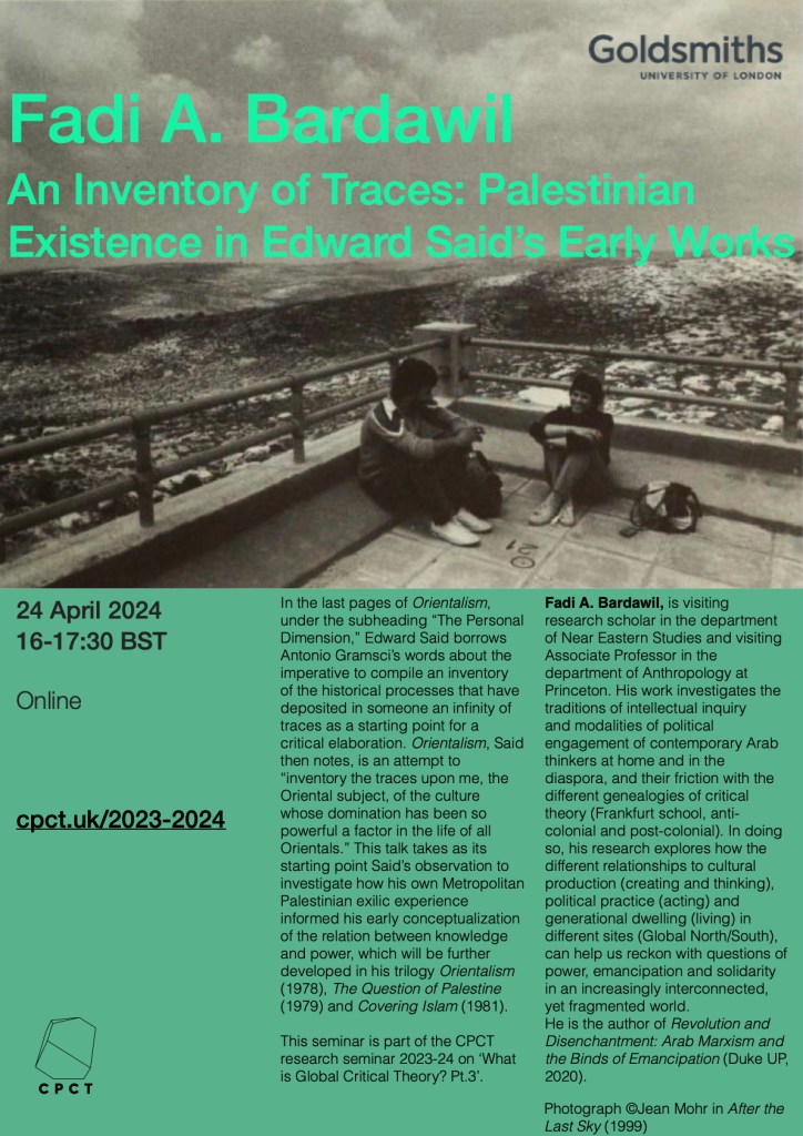 In the last pages of Orientalism, under the subheading “The Personal Dimension,” Edward Said borrows Antonio Gramsci’s words about the imperative to compile an inventory of the historical processes that have deposited in someone an infinity of traces as a starting point for a critical elaboration. Orientalism, Said then notes, is an attempt to “inventory the traces upon me, the Oriental subject, of the culture whose domination has been so powerful a factor in the life of all Orientals.” This talk takes as its starting point Said’s observation to investigate how his own Metropolitan Palestinian exilic experience informed his early conceptualization of the relation between knowledge and power, which will be further developed in his trilogy Orientalism (1978), The Question of Palestine (1979) and Covering Islam (1981).