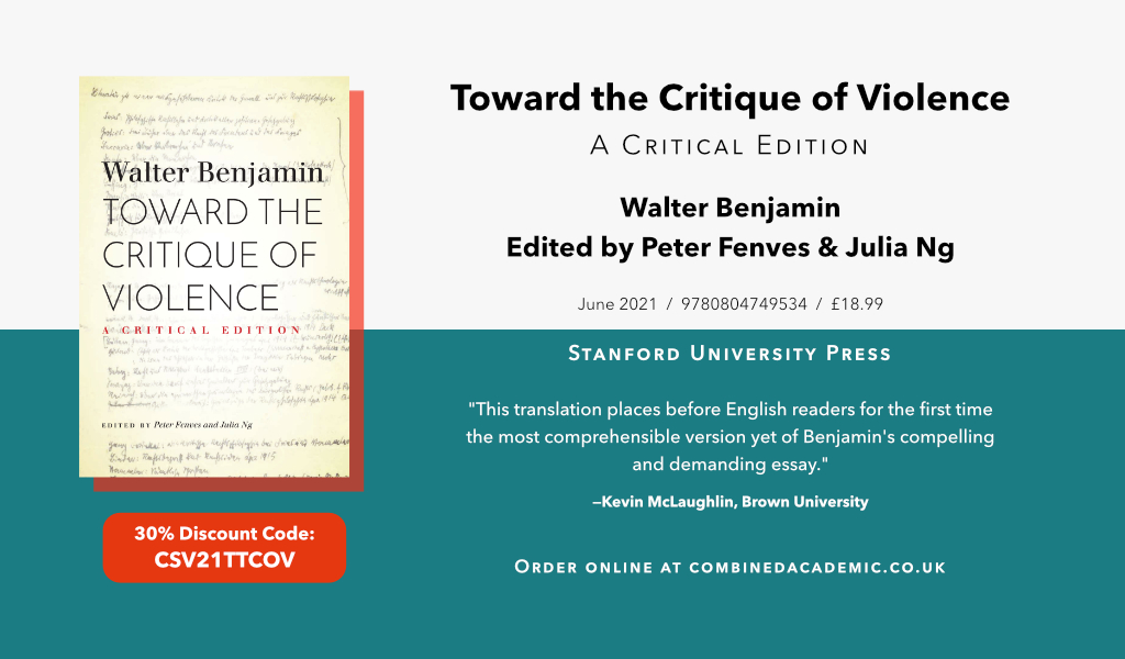 The colloquium will take place on May 23, 2022 at Northwestern University. Those interested in participating should send an abstract (approx. 250 words) for a 15-minute presentation to Jörg Kreienbrock (j-kreienbrock@northwestern.edu) by April 10th. All participants will receive a copy of Toward the Critique of Violence: A Critical Edition in preparation for their presentation and a modest honorarium. Participants will be responsible for their own accommodation and travel expenses. As noted above, the range of topics is entirely open; but it is expected that some of the presentations will be concerned with the political, cultural, and philosophical conditions of the 1920s in and beyond the European circumstances that come under discussion in Benjamin’s essay, while other presentations will be more concerned with present situations; still others may be directed far afield from both the 1920s and the 2020s as well as the European focus through which Benjamin explicitly frames his analysis and implicitly punctures as well. The texts collected into Toward the Critique of Violence intersect with a wide variety of humanistic and social-scientific disciplines, and the colloquium welcomes proposals that reflect the breadth of Benjamin’s essay and its associated writings.