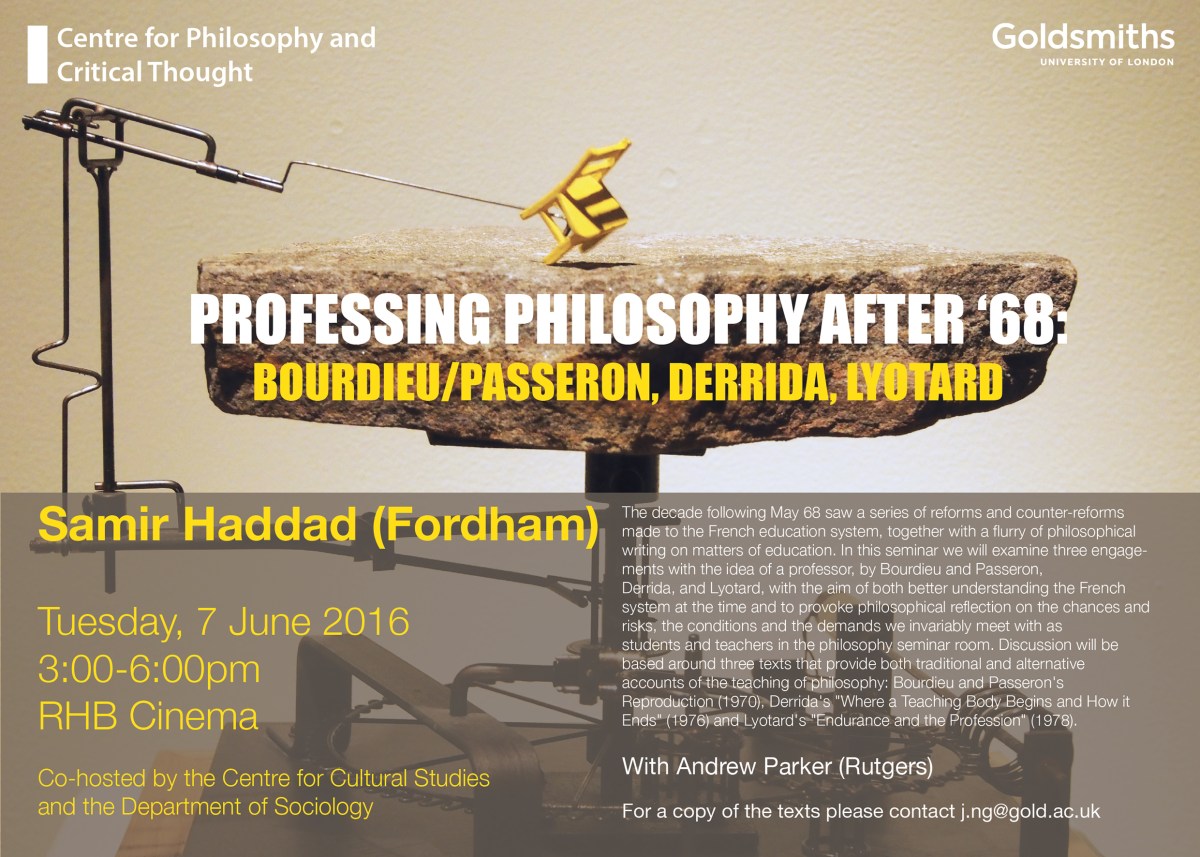 Professing Philosophy after ’68: Bourdieu/Passeron, Derrida, Lyotard September 22, 2016 by CPCT Admin Leave a comment ← Previous Image Next Image → Samir Haddad (Fordham) on Professing Philosophy after ’68: Bourdieu/Passeron, Derrida, Lyotard – 07/06/2016 about the event Like Loading...